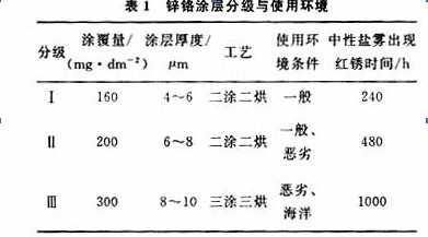 鋅鉻涂層分級(jí)與使用環(huán)境見表1。