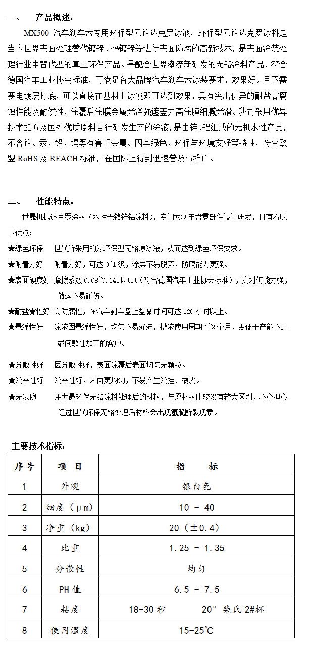 產(chǎn)品名稱:MX500汽車剎車盤專用環(huán)保型無鉻達(dá)克羅涂液