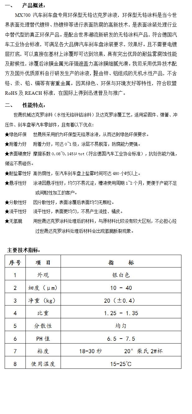 產(chǎn)品名稱:MX700汽車剎車盤專用環(huán)保型無鉻達(dá)克羅涂液